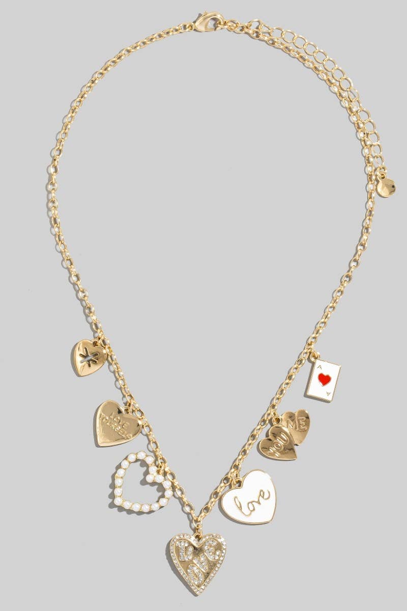 This necklace features a fashionable assorted love heart charm style. Revel in the intricate design that effortlessly distinguishes this necklace, making it a statement piece.
