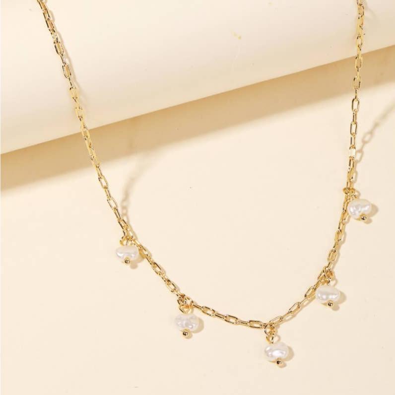 This necklace showcases a timeless chain link pearl station style. Celebrate the art of accessorizing with this piece that effortlessly encapsulates modern trends.
