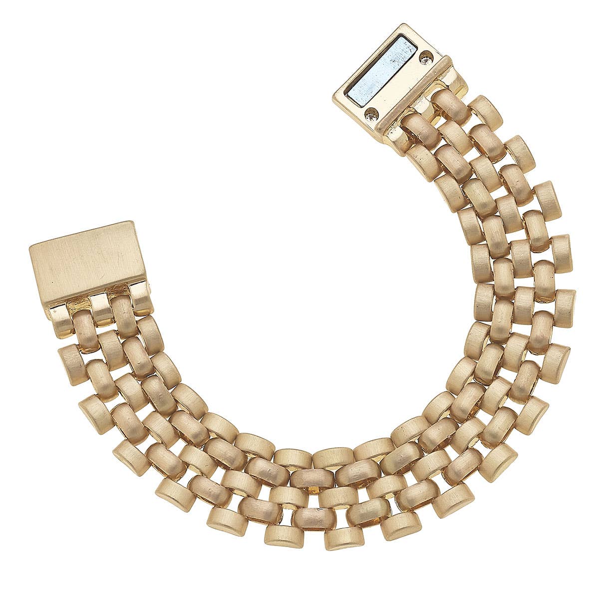 Elevate your style with our Della Watchband Magnet Bracelet in Satin Gold or Two Tone. This versatile accessory is not only trendy, but also functional with its magnet closure. Say goodbye to struggling with clasps and hello to effortless wear and secure fit. A must-have for any fashion-forward individual.