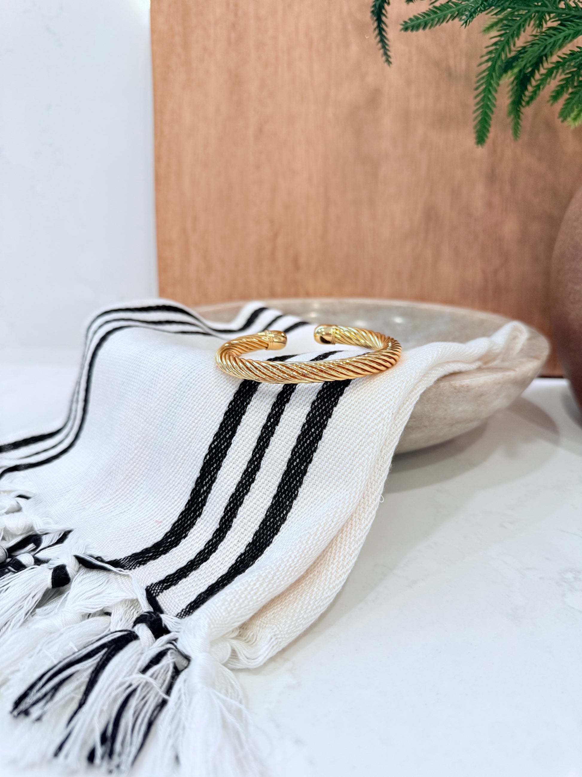 Elevate your style with our Gold Chunky Twist Open Bangle. Crafted with luxurious gold, this chunky bracelet adds a touch of sophistication to any outfit. Its unique twist design is sure to make a statement, making it the perfect accessory for any fashion-forward individual.