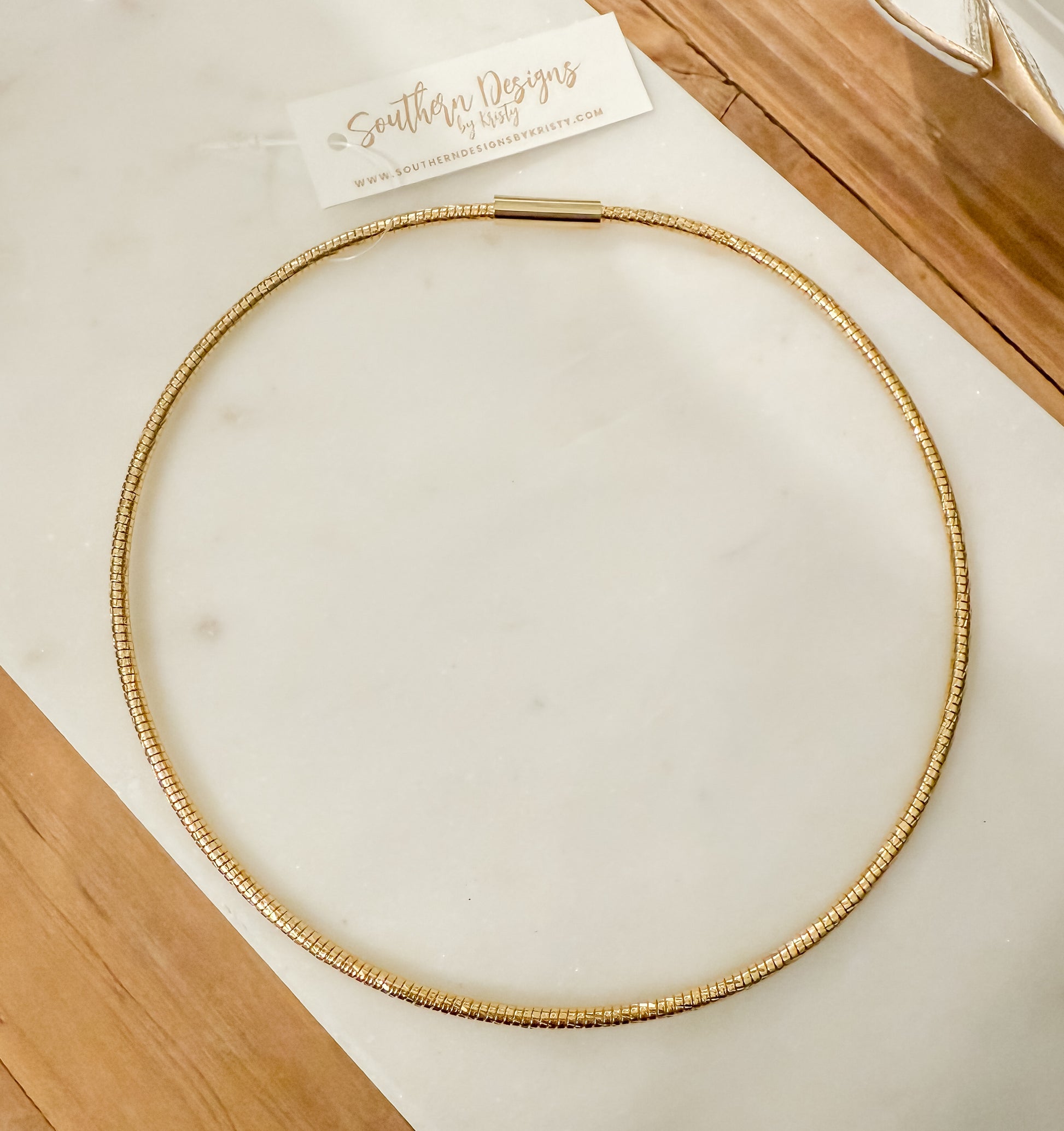 Elevate your look with timeless sophistication. This sleek gold collar choker necklace features a flexible, textured design that hugs the neckline beautifully. Its modern yet classic style makes it the perfect piece to wear solo for a minimal chic statement or layered with your favorite chains for added dimension.