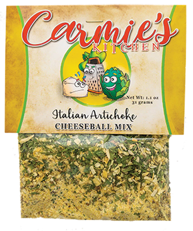 Artichoke and aromatic Italian herbs create a delicious, flavored cream cheese. Just add 16 oz softened cream cheese to our mix to prepare a delicious cheeseball. Roll in chopped pecans or almonds, and/or add shredded cheese to the mixture. Serve with toasted bread, crackers, or use as a bagel spread. Carmie's dip mixes make the perfect stocking stuffer, hostess gift, holiday gift, or holiday party addition!