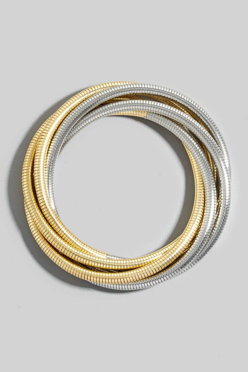 This bracelet displays a vibrant knotted elastic metallic coil set style. Delight in the intricate details that make this bracelet an essential element in expressing your fashion identity.
