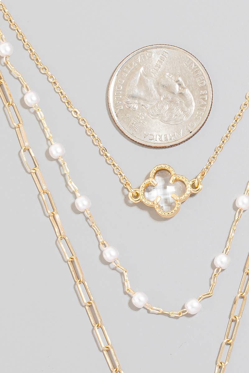 Layered Pearl Beaded Faceted Clover Pendant Necklace Set