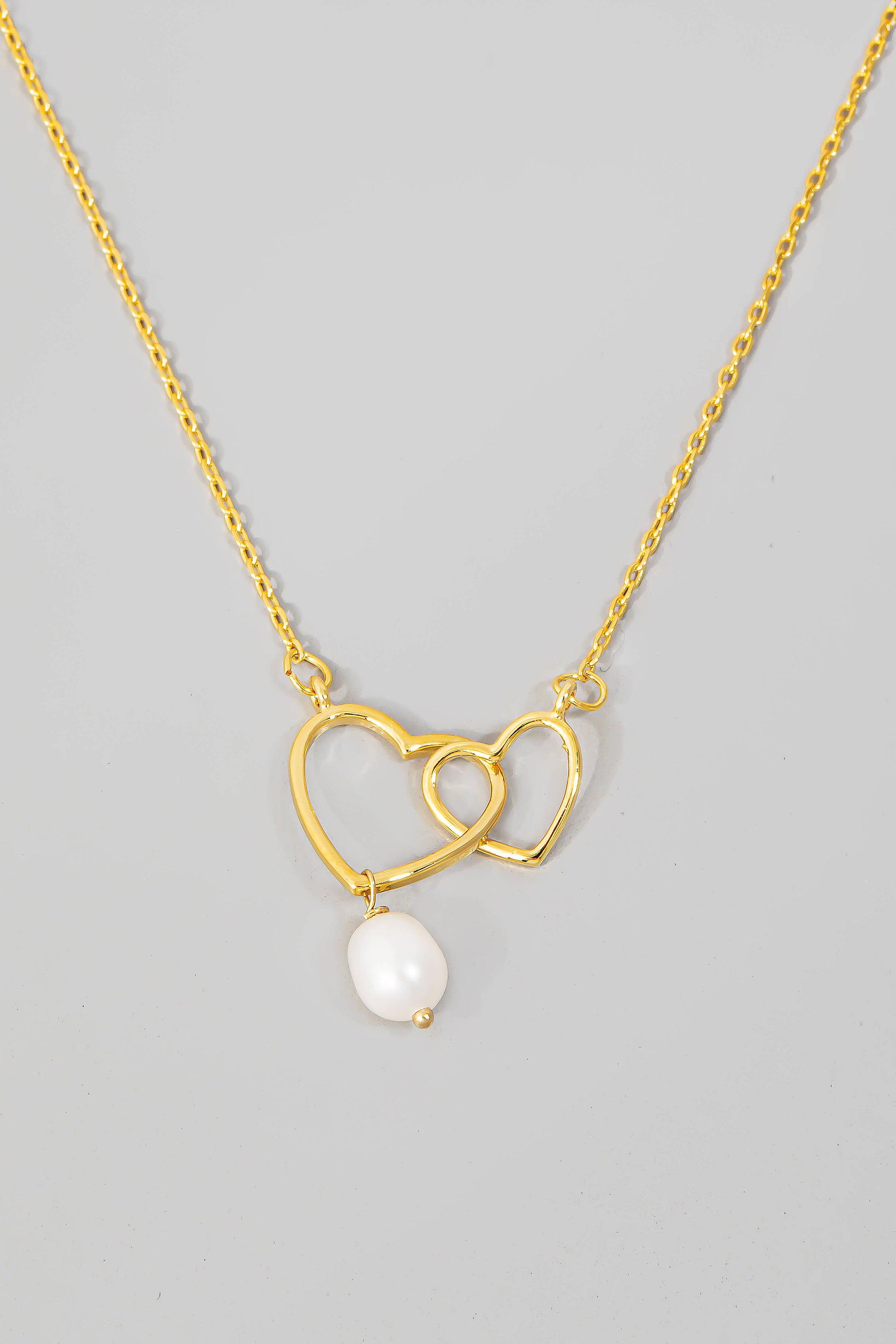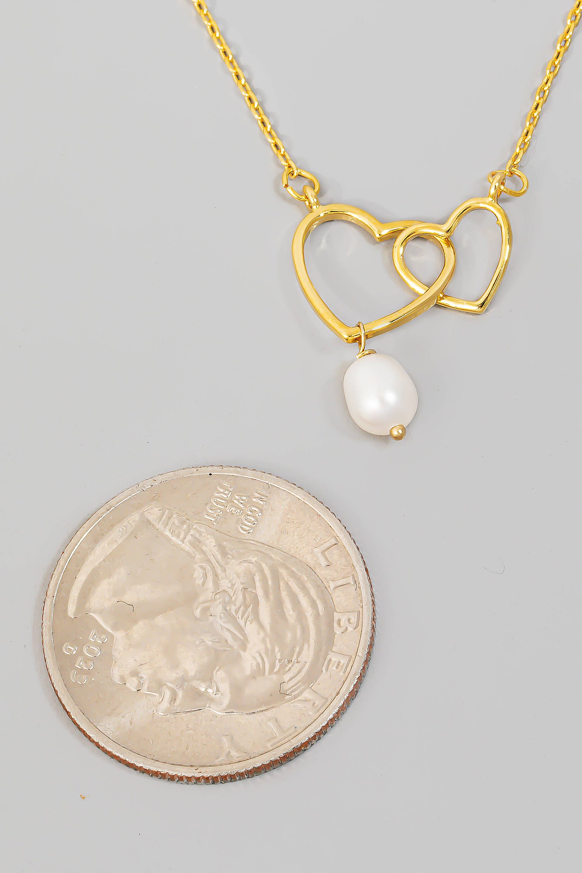 This necklace features a fashionable linked hearts and pearl pendant style. Immerse yourself in the details of design, as this accessory effortlessly becomes a conversation starter.