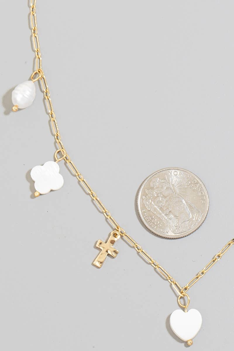 Mother Of Pearl Clover And Heart Charms Chain Necklace