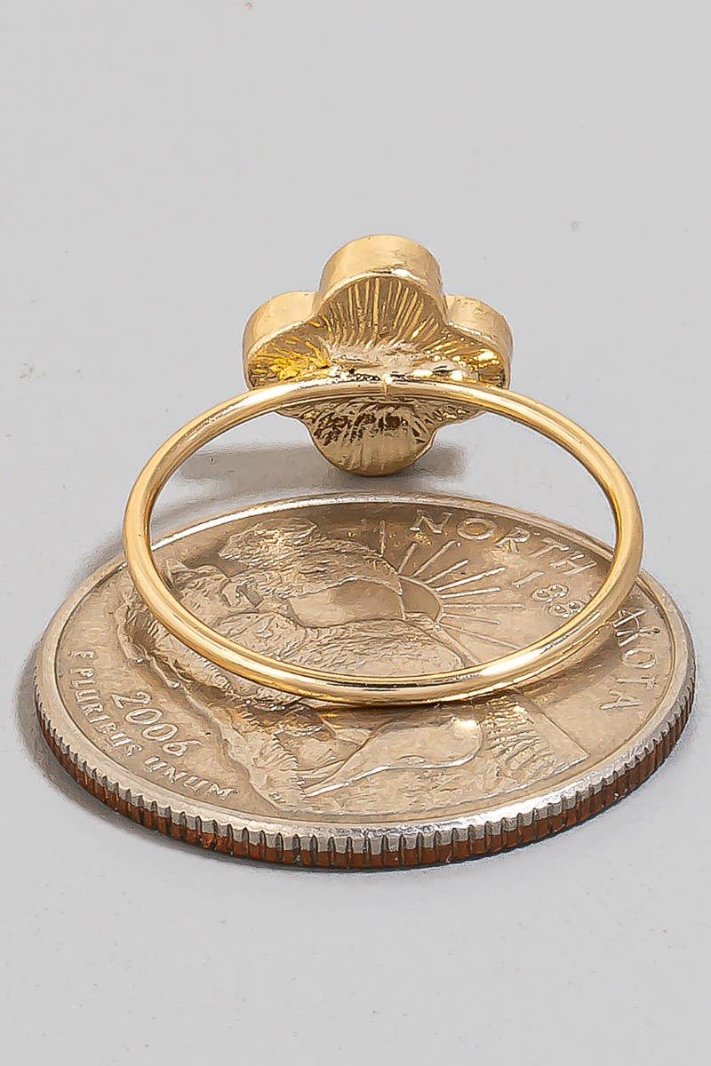 This ring displays a fashionable mother of pearl clover dainty band style. Witness the perfect fusion of style and functionality as this ring effortlessly complements your lifestyle.