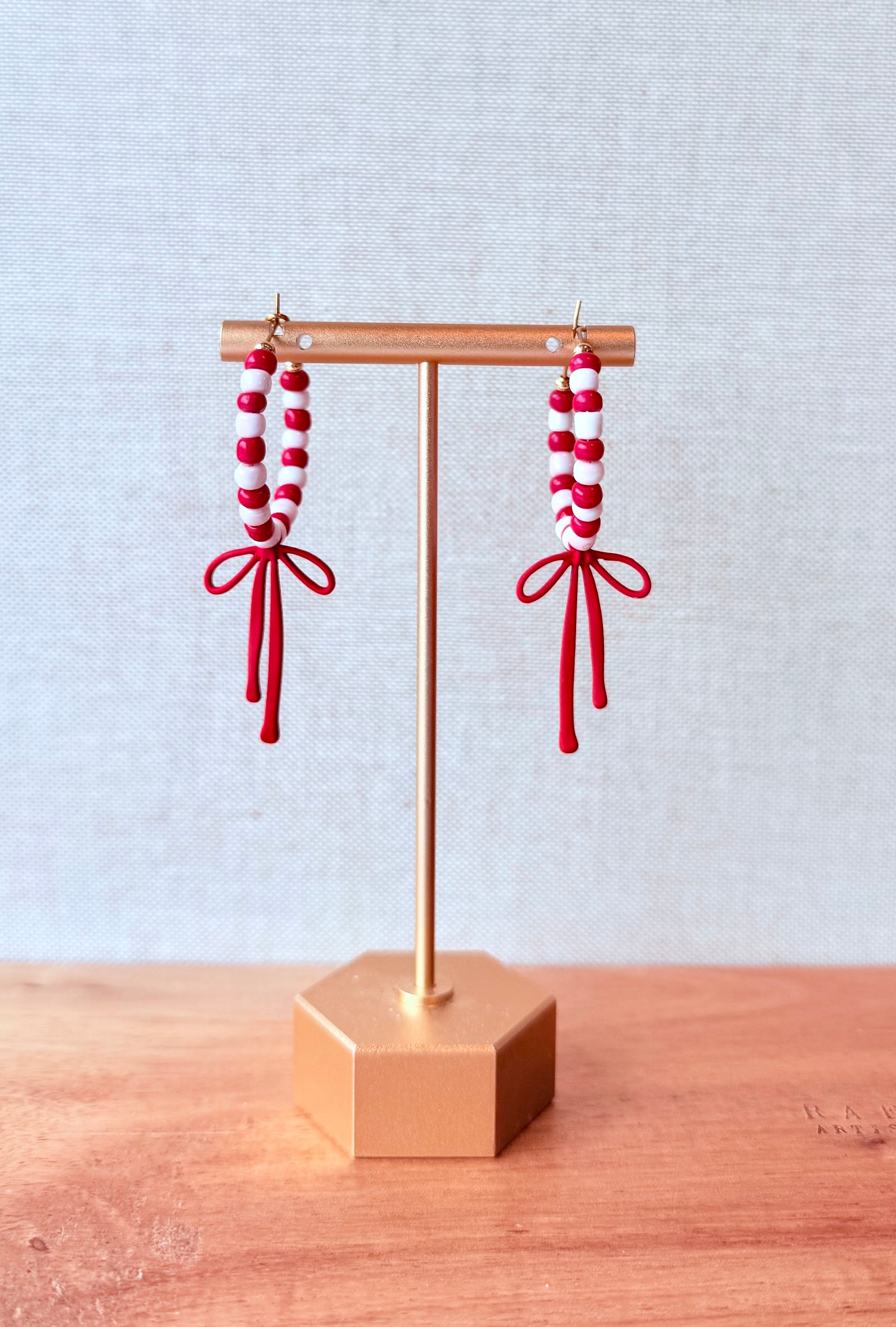 Add a little sweet season magic to your holiday style with our Must Love Bows Hoop Earrings. Handmade with love, these festive hoops feature vibrant red, pink and white beads paired with the cutest lightweight bow drops. The perfect blend of classic Southern sweetness.