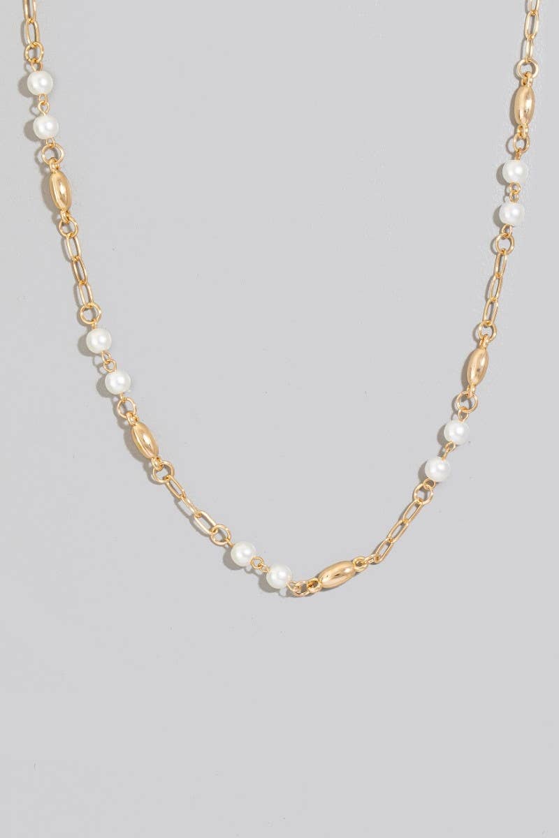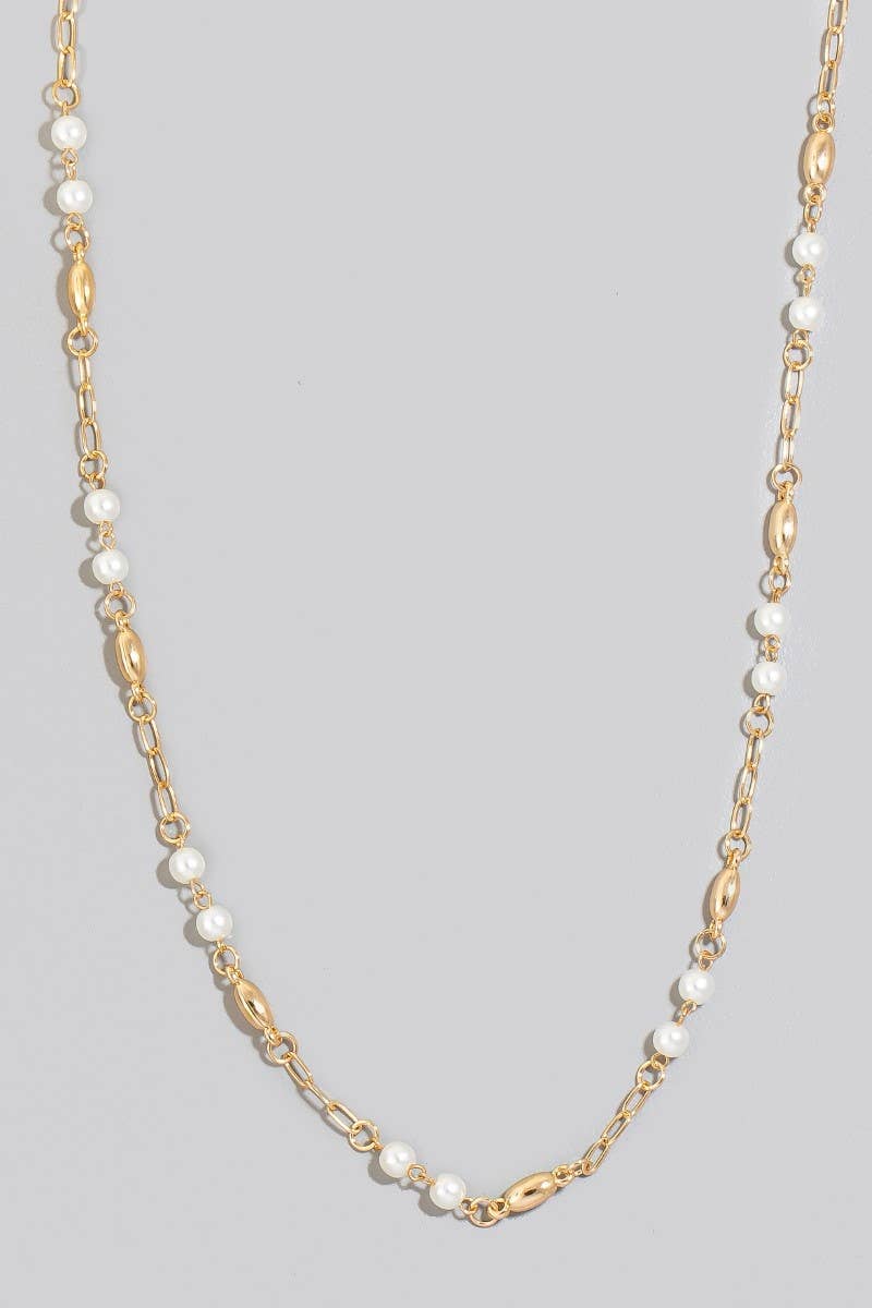 This chain necklace displays a vibrant pearl and metallic station style. Experience refined sophistication with this understated yet stylish piece.