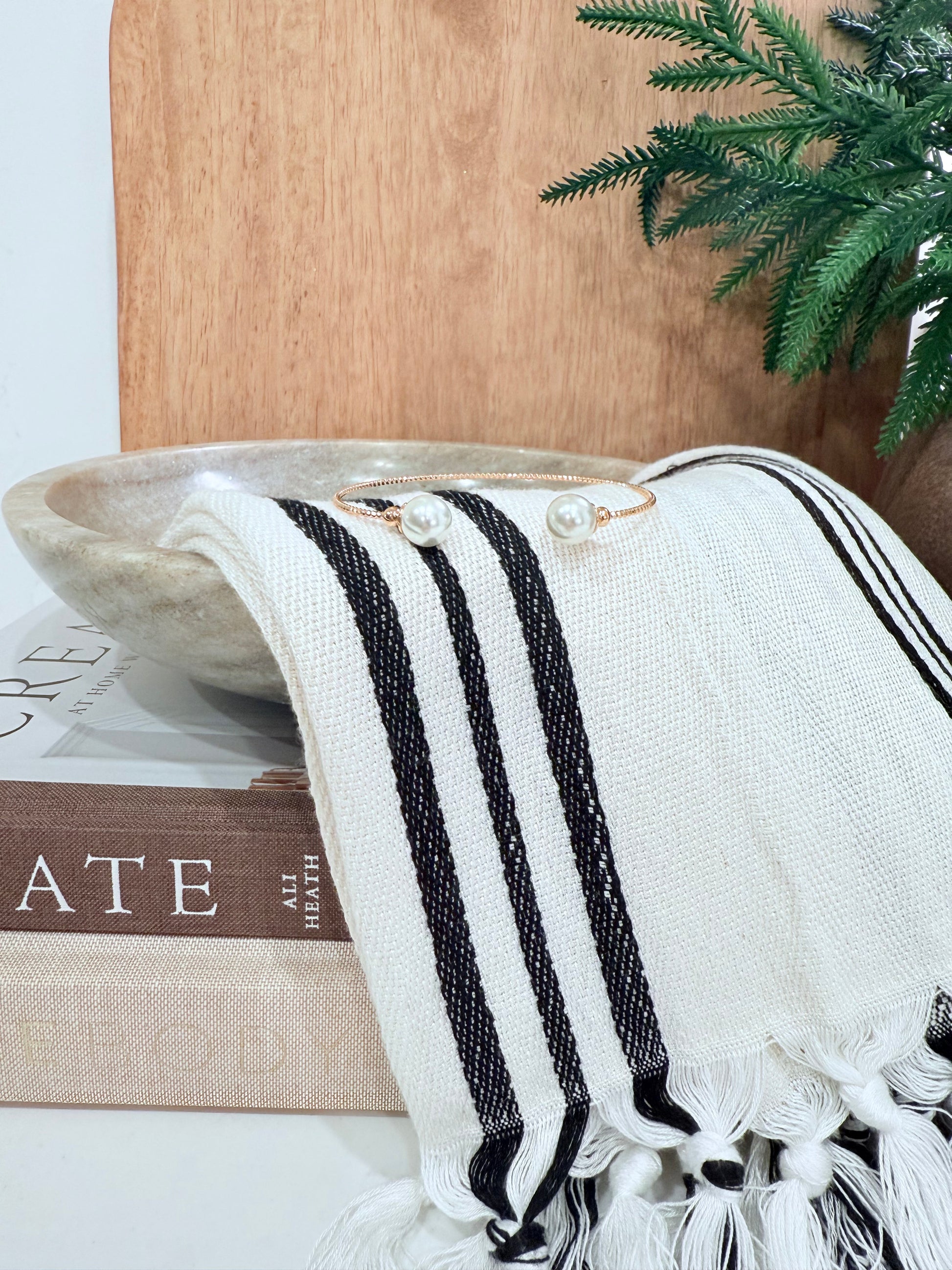 This cuff bracelet introduces a unique pearl bead open style. Redefine your look effortlessly with this standout, on-trend piece.