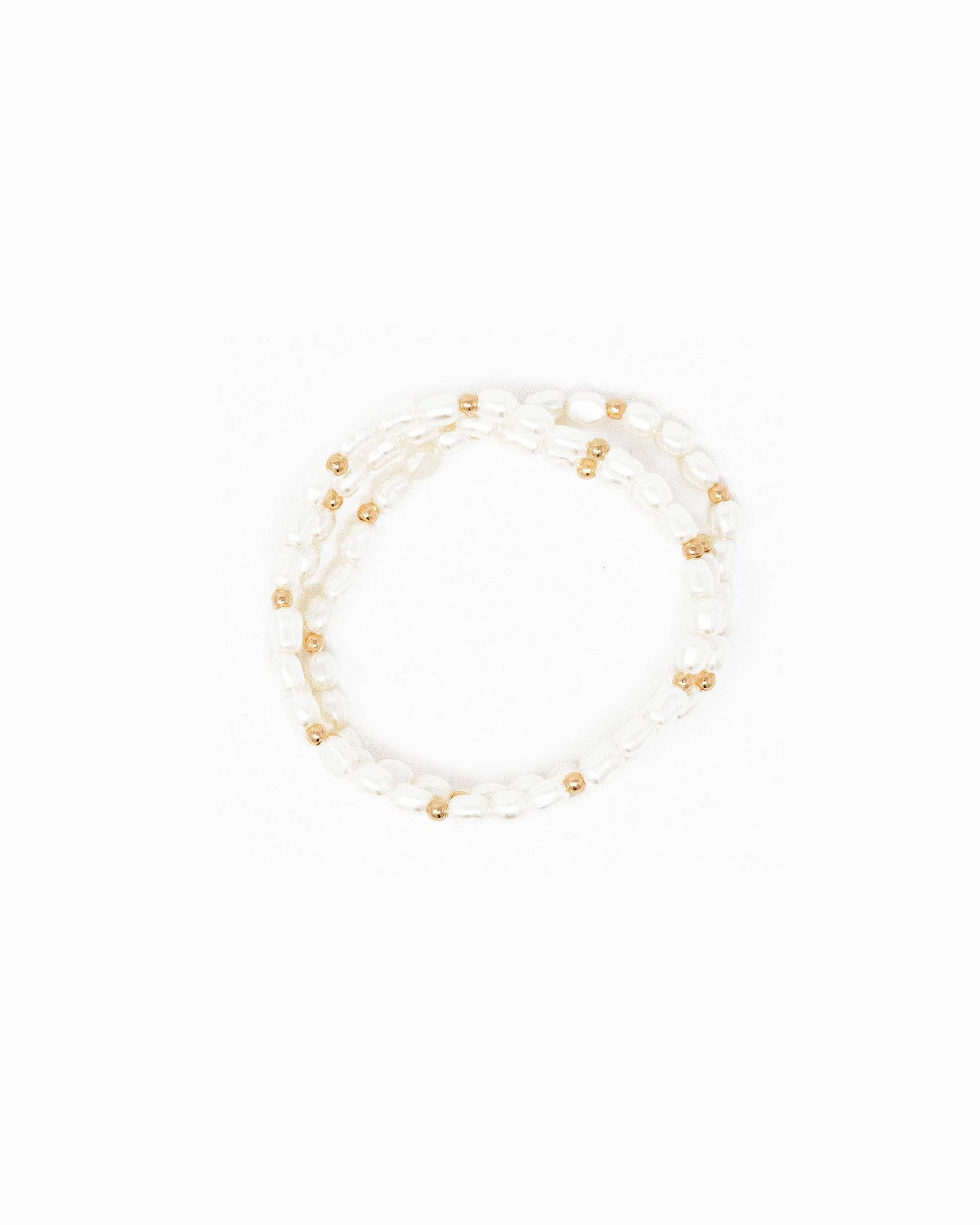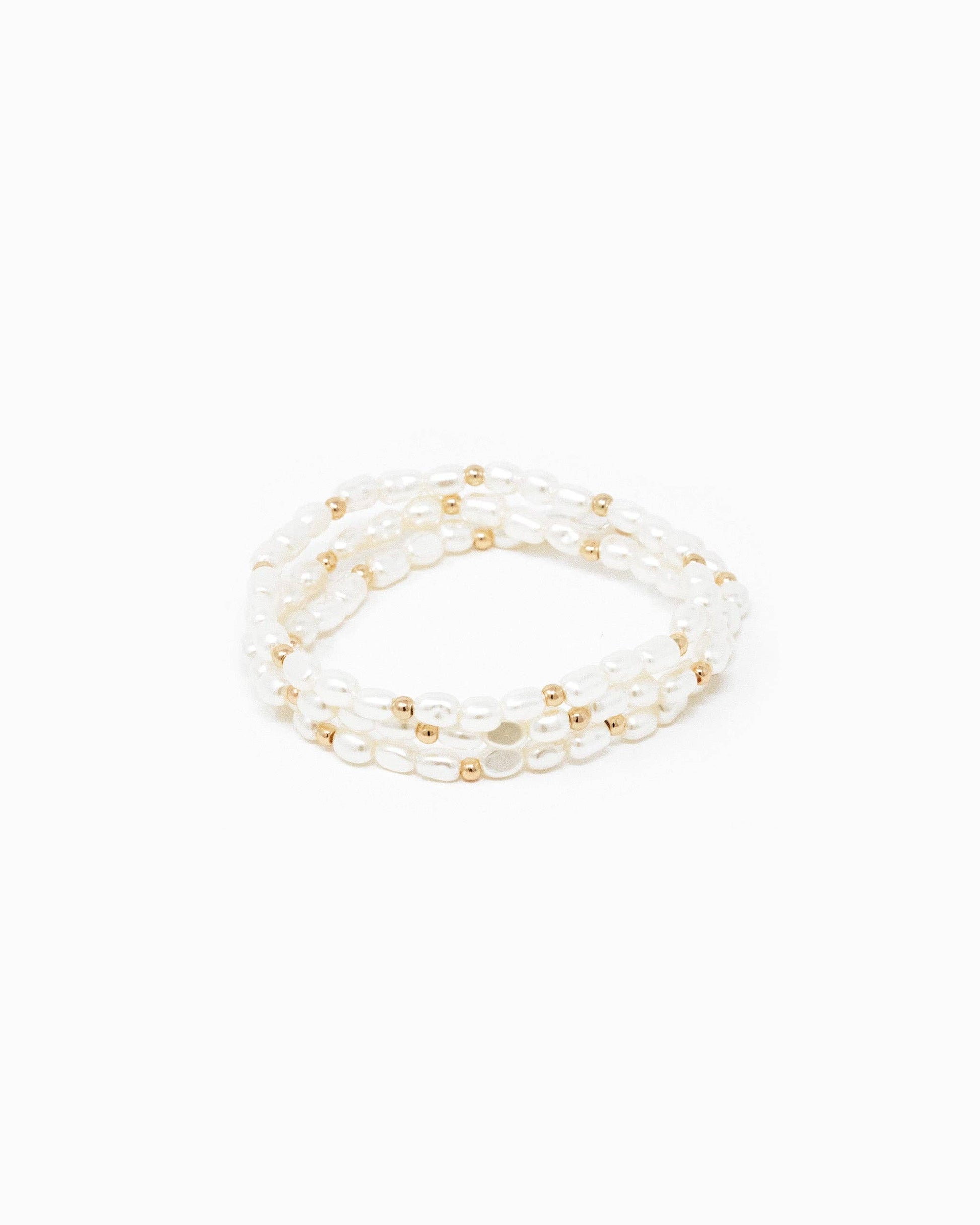 Acrylic pearl stretch bracelets coming in a set of three for layering bracelet wear or mix and match with other metal bangles or chain bracelets.
