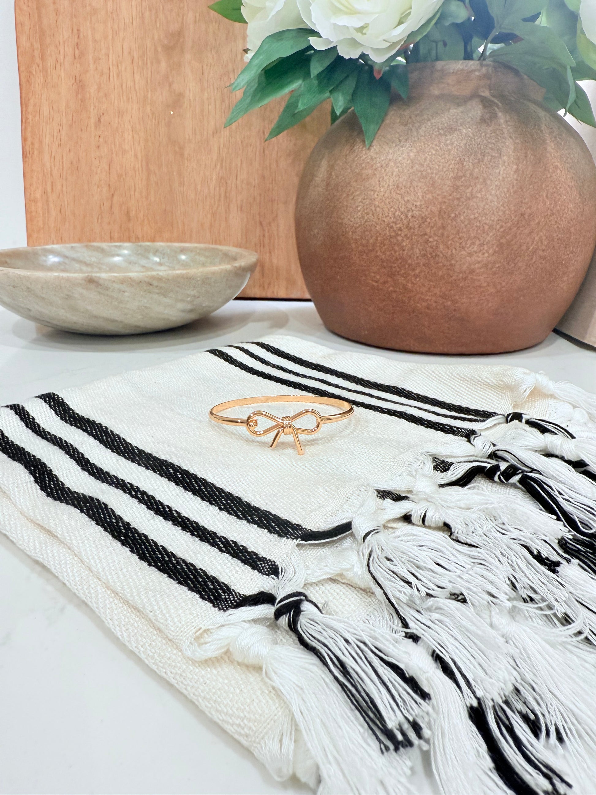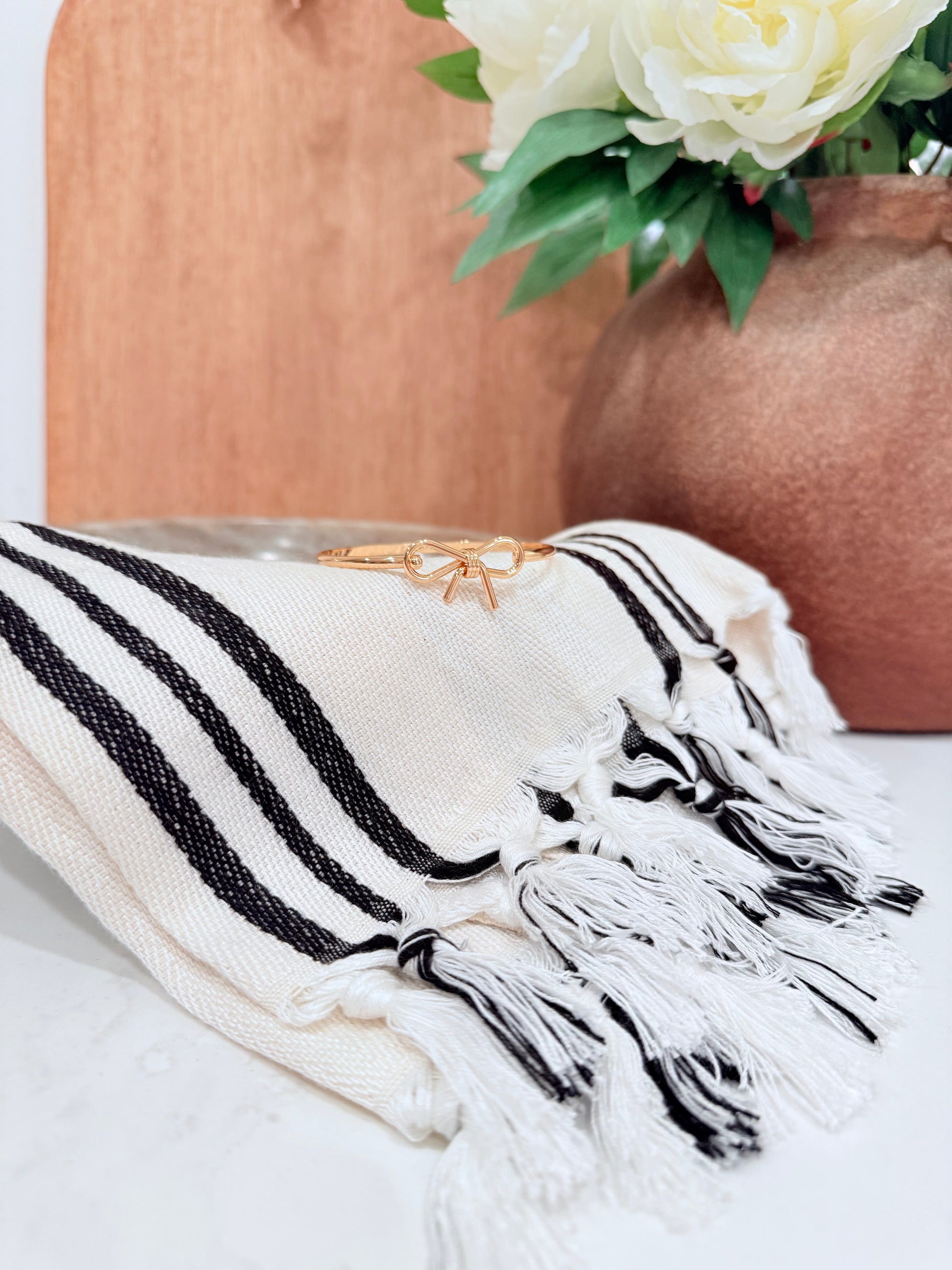 This bangle bracelet displays a fashionable ribbon bow metallic style. Savor the allure of detailed craftsmanship in this exquisite accessory.