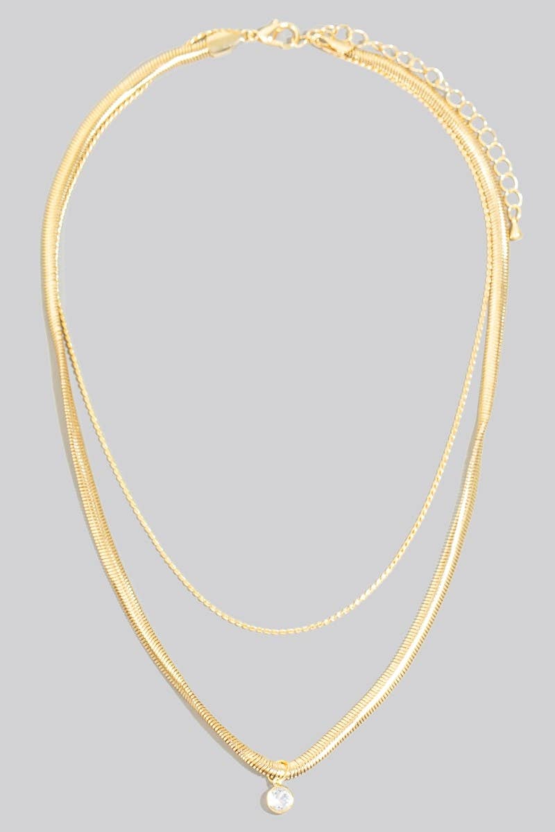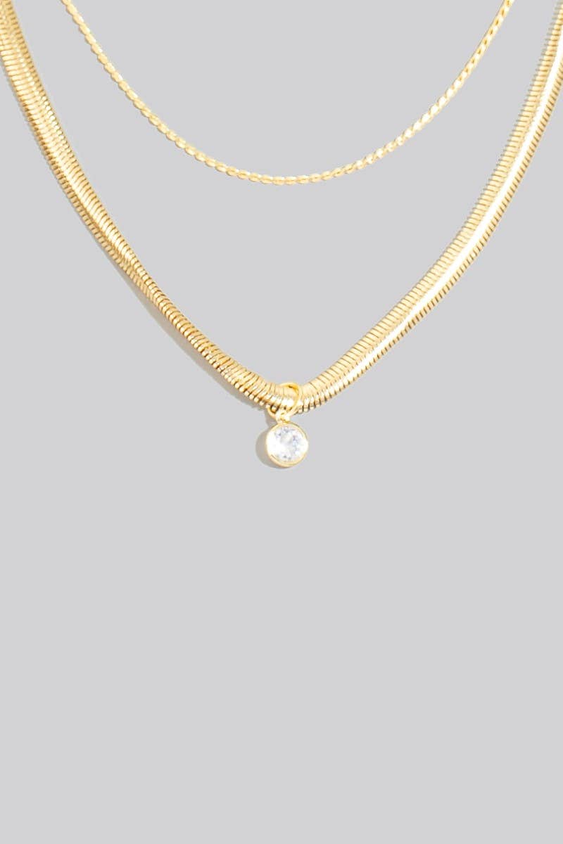 This necklace displays a vibrant round cubic zirconia pendant layered chains style. Discover the perfect balance of subtlety and flair as this necklace effortlessly completes your look.