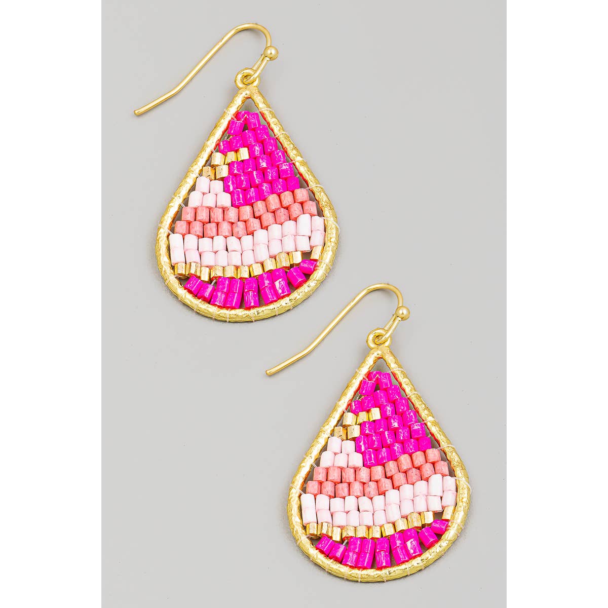 This pair of earrings brings a unique seed beaded tear dangle hook style. Indulge in the allure of exquisite craftsmanship as this accessory effortlessly adds a touch of luxury to your attire.