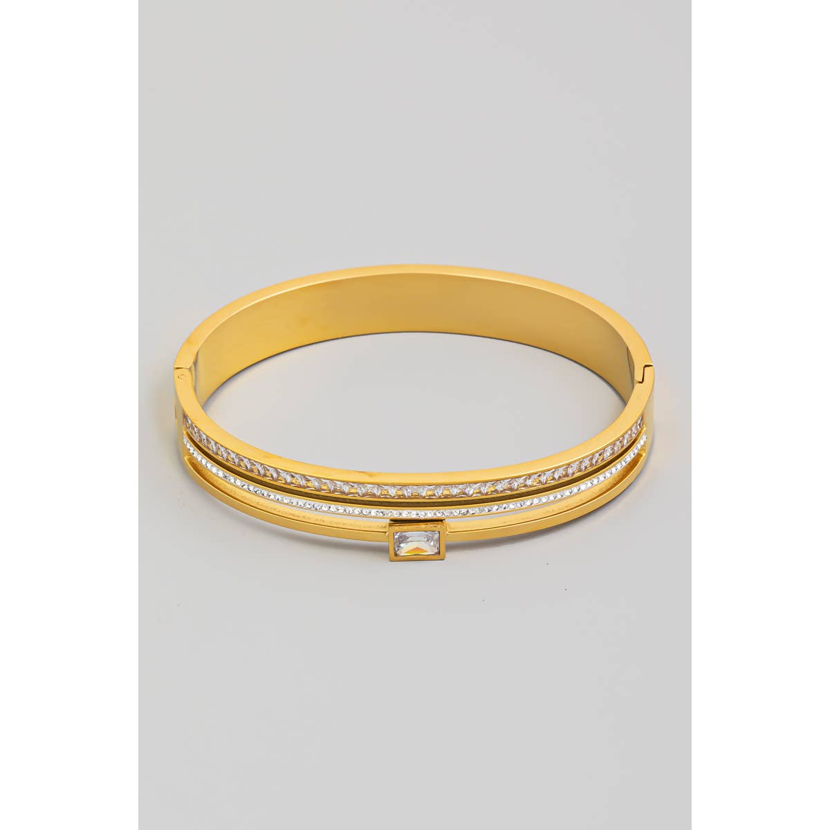 This everyday bangle is crafted from durable stainless steel and adorned with sparkling pave rhinestones. The perfect accessory for any occasion, it adds a touch of elegance to any outfit. Lightweight yet sturdy, it's a must-have for any jewelry collection.