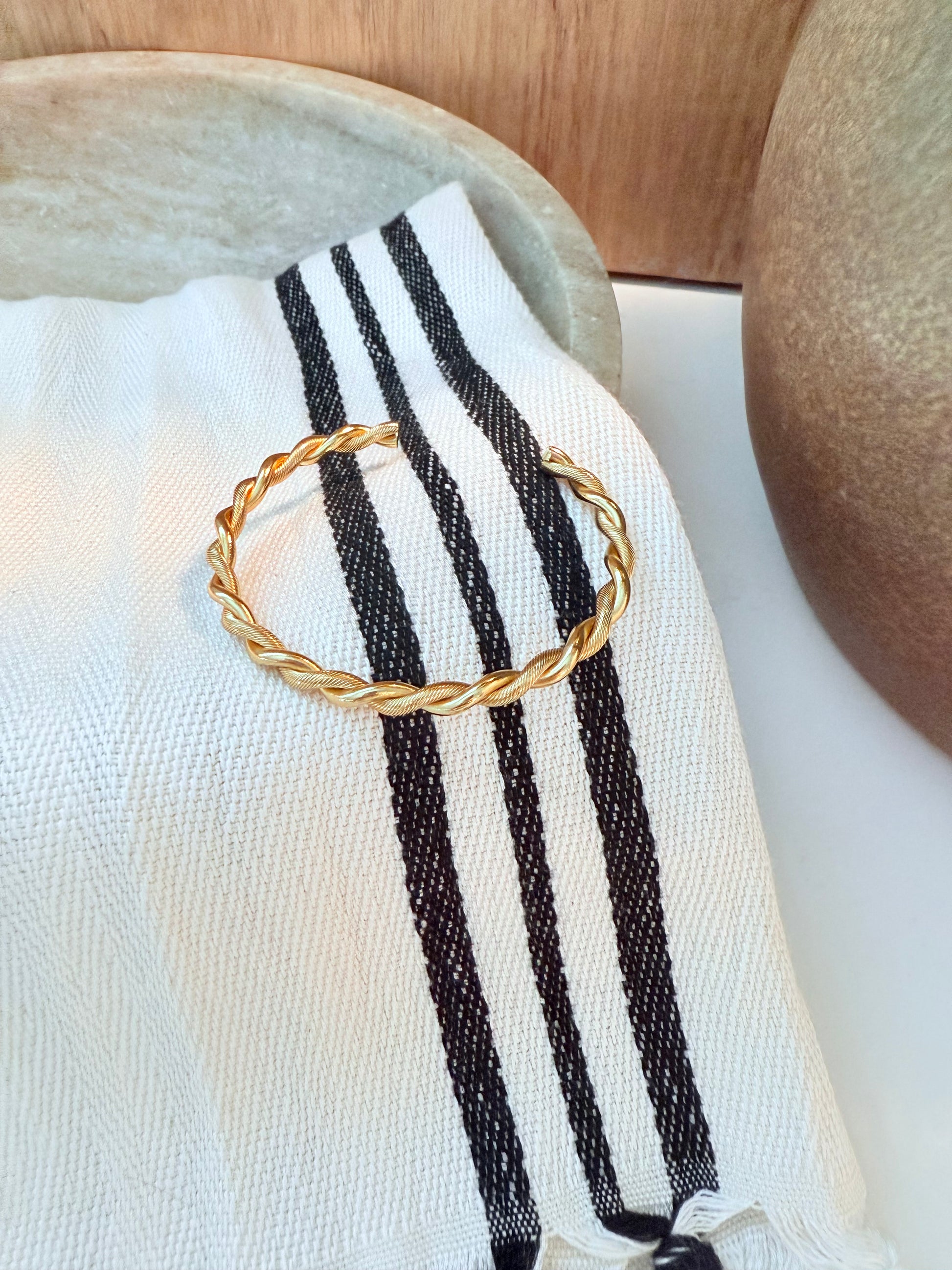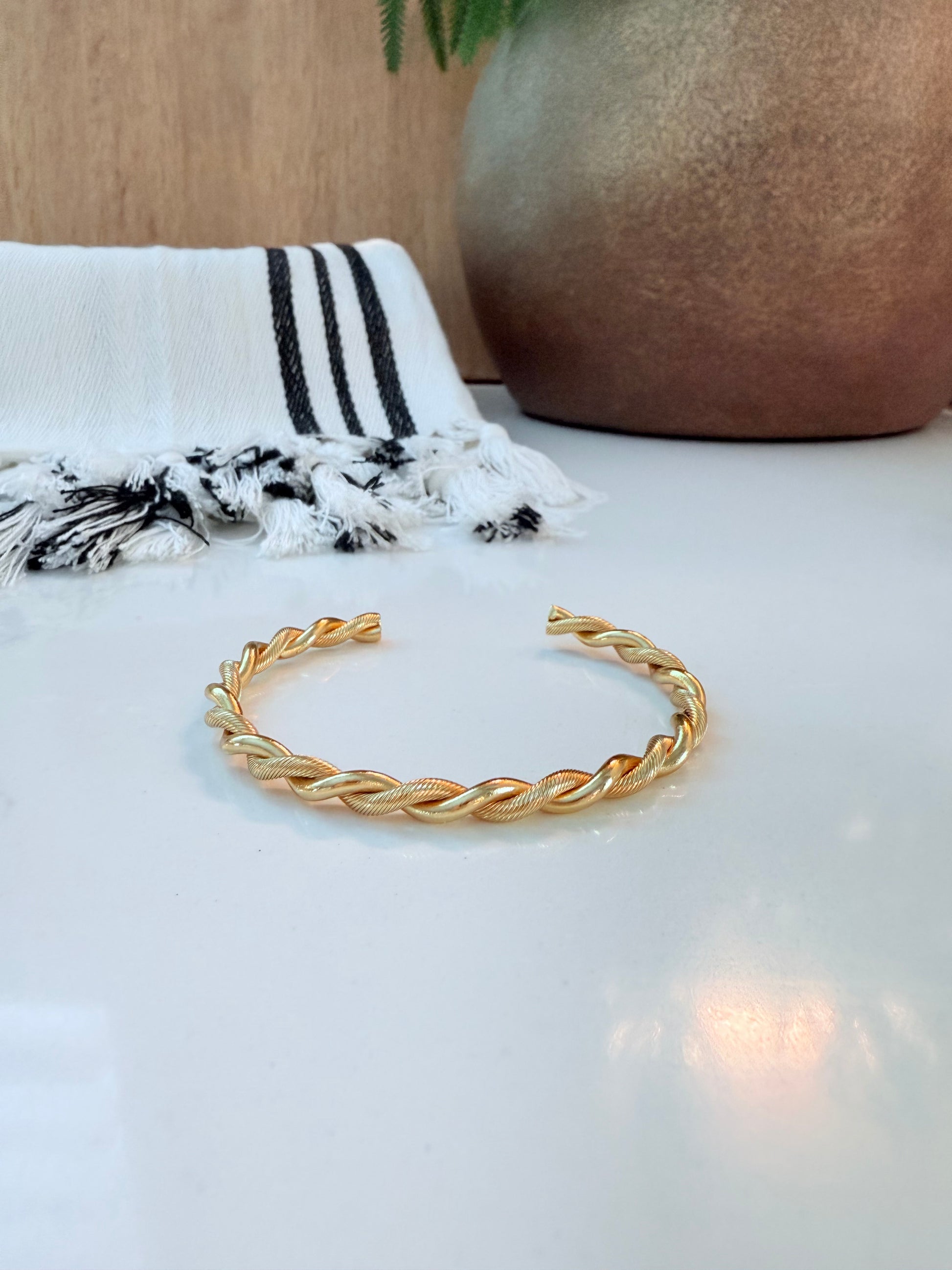 This designer inspired Twist Cuff Bangle is a must-have addition to any accessory collection. With its unique twist design, it adds a touch of elegance to any outfit. Made with high-quality materials, it is both durable and stylish. Upgrade your look with this must-have piece.