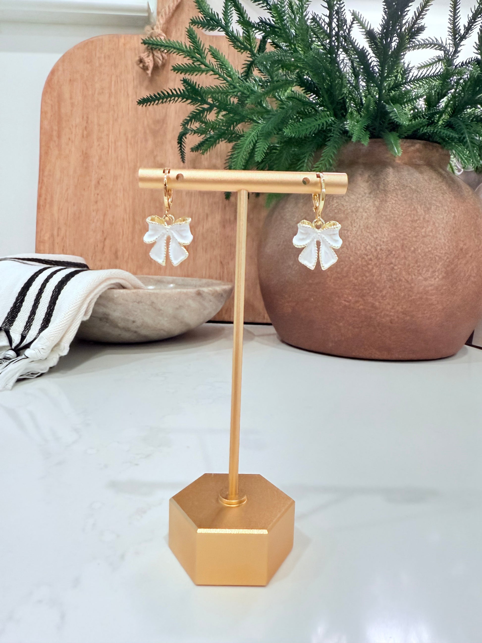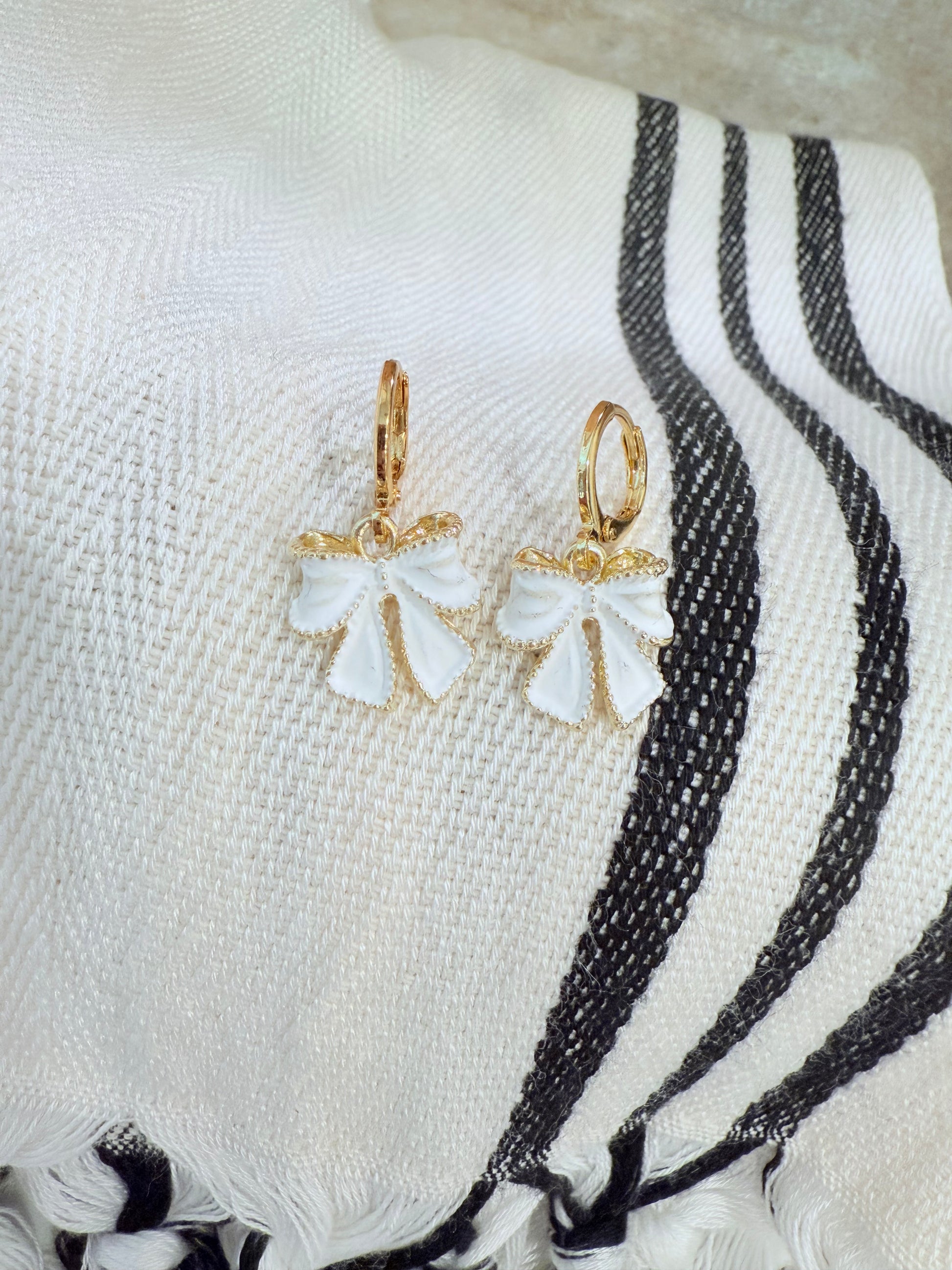 Indulge in the ultimate accessory of luxury with our beautiful White Ribbon earrings. Made with stunning white and gold ribbon bows, these earrings will elevate any outfit and lend a touch of elegance to your look. Add a touch of sophistication to your style with these exclusive earrings.