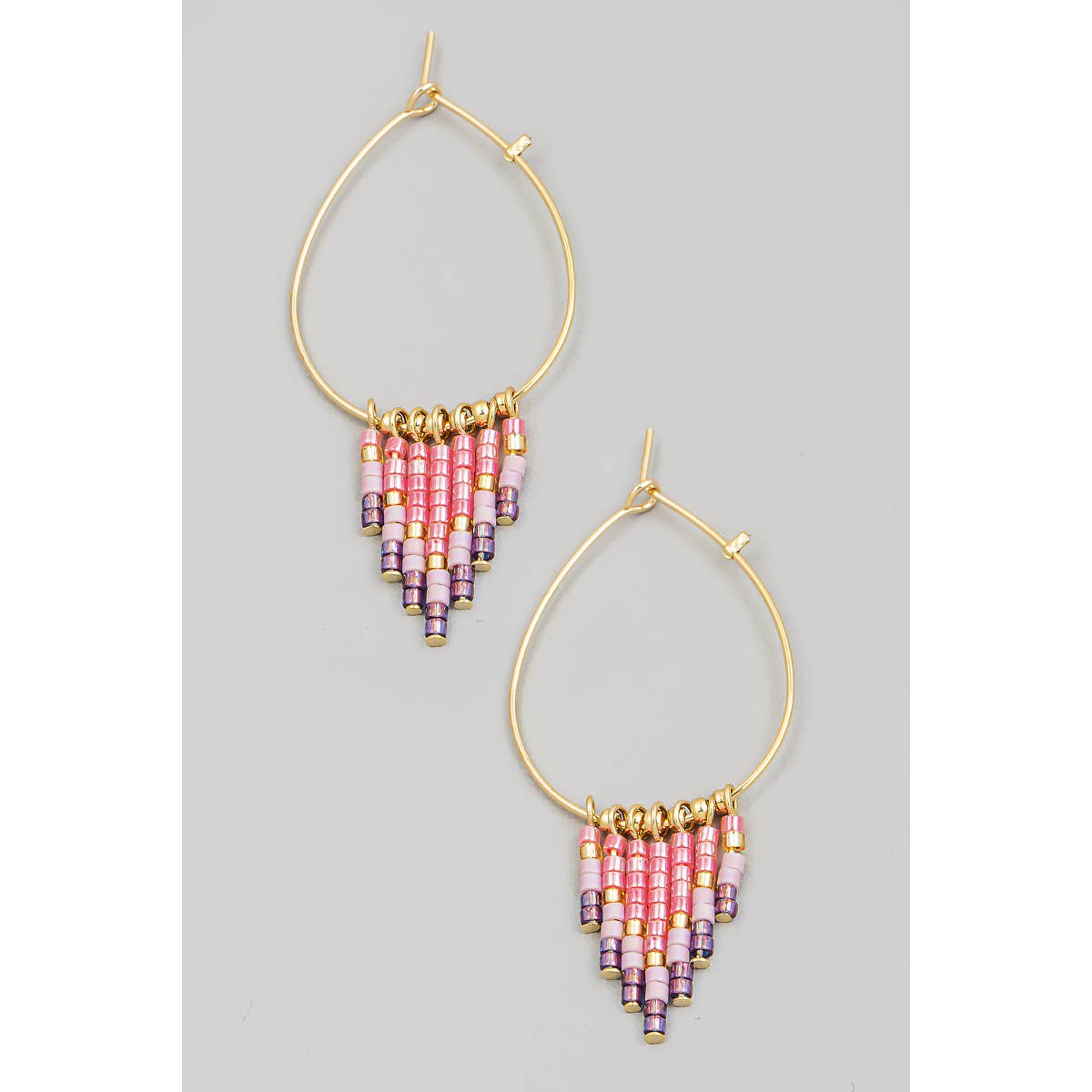 Wire Teardrop Bead Fringe Hoop Earrings Pink or Turquoise